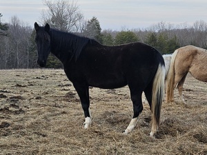 Gorgeous black mare with four white socks. This mare is built beautifully and carries the tobiano gene....